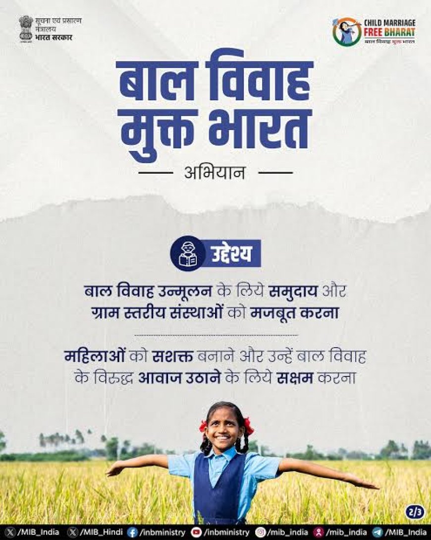 यह पहल भारत सरकार द्वारा संचालित किए जा रहे बाल विवाह मुक्त भारत अभियान का एक महत्वपूर्ण हिस्सा है। इस अभियान का शुभारंभ भारत सरकार के महिला एवं बाल विकास मंत्री द्वारा पिछले वर्ष 27 नवंबर 2024 को किया गया था। प्रधानमंत्री श्री नरेंद्र मोदी के नेतृत्व में विकसित भारत के विजन के साथ शुरू किया गया यह कैंपेन 2030 तक बाल विवाह को पूर्ण रूप से समाप्त करने के लिए एक देशव्यापी प्रयास है। इसका उद्देश्य बच्चों, सर्वाइवर्स, महिलाओं और सिविल सोसाइटी को सरकार के साथ जोड़ना है, ताकि हर बच्चे को शिक्षा, सुरक्षा और अवसर का अधिकार मिल सके। इस अवसर पर जिले में संचालित समस्त शैक्षणिक संस्थानों, पुलिस थानों, छात्रावासों, बाल देखरेख संस्थाओं, ग्राम पंचायतों एवं नगरीय निकायों सहित सभी उपयुक्त एवं चिह्नित स्थानों में बाल विवाह के विरुद्ध शपथ ली जाएगी।