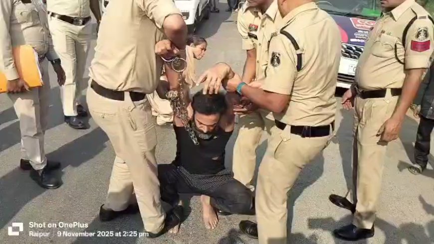 छत्तीसगढ़ की रायपुर पुलिस ने आरोपी सूदखोर वीरेंद्र तोमर को 8 नवंबर की शाम ग्वालियर से गिरफ्तार किया था। आज सुबह उसे रायपुर लेकर पुलिस पहुंची, जिसके बाद उसे पुरानी बस्ती लाया गया। यहां से उसका जुलूस निकालते हुये पैदल ही जिला कोर्ट लाया गया। इस दौरान वीरेंद्र तोमर फटी बनियान में लंगड़ाते हुये अचानक सड़क पर गिर गया। पुलिसकर्मियों ने उसे उठाया और फिर वाहन में बैठाकर अस्पताल लाया गया, जहां पर उसका मेडिकल चेकाअप कराया गया।