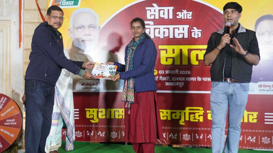 जगदलपुर, 04 जनवरी 2026 / जनसंपर्क विभाग द्वारा शनिवार की शाम को स्थानीय बस्तर आर्ट गैलरी में राज्य के रजत जयंती वर्ष तथा राज्य शासन की सेवा और विकास के दो साल सुशासन से समृद्धि का सफर पर केंद्रित सांस्कृतिक कार्यक्रम सहित मनोरंजक खेल एवं क्विज प्रतियोगिता का आयोजन किया गया।