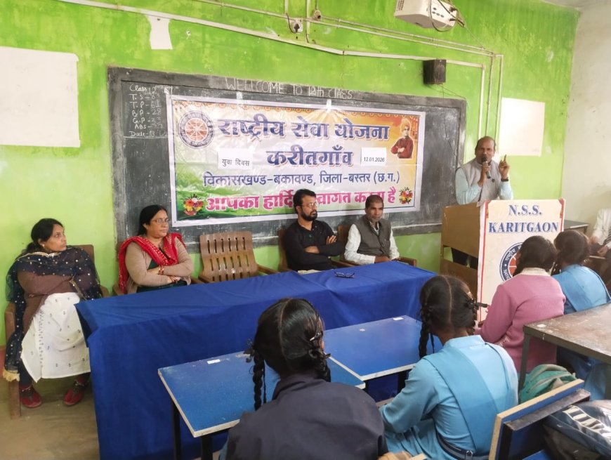 जगदलपुर, 14 जनवरी 2026/ शासकीय उच्चतर माध्यमिक विद्यालय करीतगांव में सोमवार, 12 जनवरी 2026 को राष्ट्रीय सेवा योजना (एनएसएस) इकाई के तत्वावधान में स्वामी विवेकानंद जी की 164वीं जन्म जयंती 'राष्ट्रीय युवा दिवस' के रूप में पूरे उत्साह और गरिमा के साथ मनाई गई। इस अवसर पर विद्यालय के शिक्षकों और एनएसएस स्वयंसेवकों ने स्वामी जी के विचारों को आत्मसात करने का संकल्प लिया।