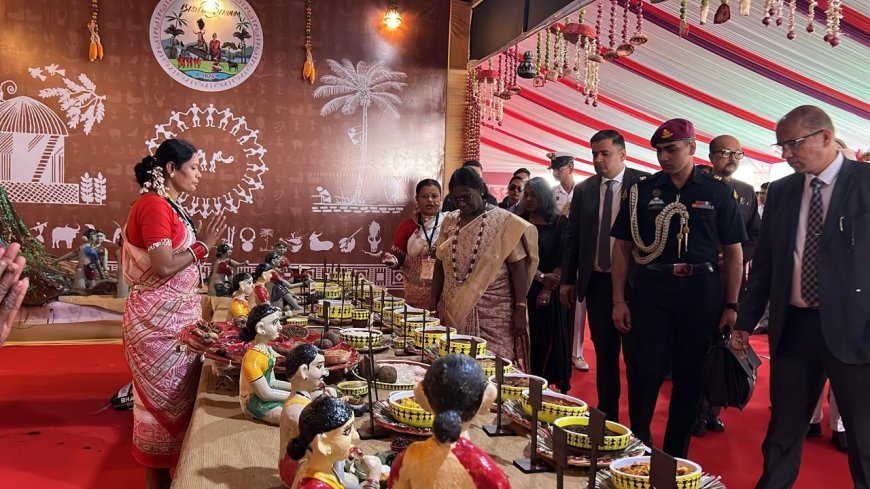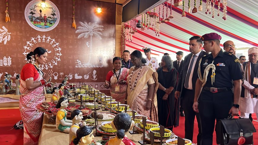 7 फरवरी 2026, जगदलपुर/ लालबाग में आयोजित बस्तर पंडूम 2026 में राष्ट्रपति श्रीमती द्रौपदी मुर्मू, राज्यपाल श्री रमेन डेका, मुख्यमंत्री श्री विष्णु देव साय ने जनजातीय परंपरा, लोक संस्कृति, जनजाति शिल्प, जनजाति व्यंजन एवं पेय पदार्थ, जनजातीय औषधि, जनजातीय चित्रकला, जनजातीय वेशभूषा-आभूषण और लोक जीवन से संबंधित लोकचित्र की प्रदर्शनी का अवलोकन कर प्रदर्शनी की सराहना की।