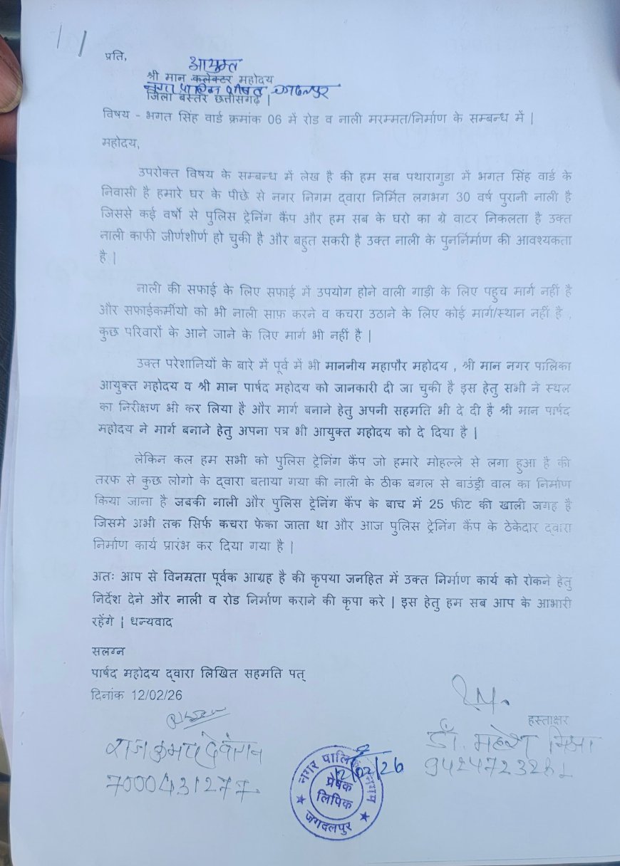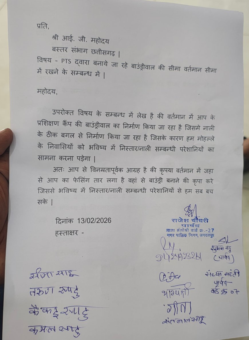 14 फरवरी 2026,जगदलपुर /नगर पालिक निगम जगदलपुर के नेता प्रतिपक्ष राजेश चौधरी ने जारी प्रेस विज्ञप्ति के माध्यम से बताया कि भगत सिंह वार्ड क्रमांक 06 में लालबाग स्थित पी टी एस घेरा के बाउंड्री वॉल बनाने से बगल से गई पुरानी नाली की सफाई कराने में परेशानी होगी जिसे लेकर पी टी एस के अधिकारियों से बाउंड्री वॉल नाली से लगभग 4 फुट दूरी पर बनाने का आग्रह किया गया परंतु पी टी एस के अधिकारी उक्त परेशानी को नजर अंदाज करके जबरन बाउंड्री वॉल बनाने की बात कर रहे हैं जिससे वार्ड वासियों को भविष्य में नाली सफाई को लेकर काफी परेशानी होगी तथा नवनिर्मित आईजी कार्यालय का आउटलेट भी इस नाली से जाता है पी टी एस का पानी भी इसी नाले से जाता है बावजूद इसके पी टी एस के अधिकारी के द्वारा नाली से सटाकर बाउंड्री वॉल बनाने की बात की जा रही है जिसे लेकर वार्ड वासियों के द्वारा आयुक्त नगर पालिक निगम जगदलपुर को आवेदन दिया तथा वार्ड वासियों ने नेता प्रतिपक्ष राजेश चौधरी के नेतृत्व में बस्तर आई. जी. श्री पी. सुंदर राज जी को भी समस्या को लेकर आवेदन दिया जिस पर आईजी साहब के द्वारा संबंधित विभाग से बात करके समस्या का समाधान करवाने का आश्वासन दिया|