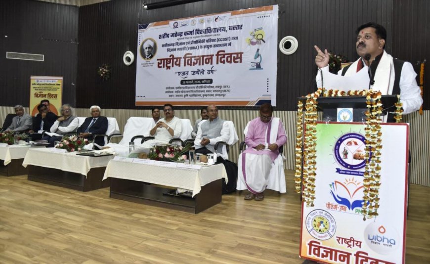 जगदलपुर, 28 फरवरी 2026/ राष्ट्रीय विज्ञान दिवस के अवसर पर उप मुख्यमंत्री श्री विजय शर्मा कार्यक्रम में मुख्य अतिथि के रूप में शामिल हुए। यह समारोह शहीद महेंद्र कर्मा विश्वविद्यालय द्वारा छत्तीसगढ़ विज्ञान एवं प्रौद्योगिकी परिषद तथा विज्ञान भारती के संयुक्त तत्वाधान में कृषि कालेज के सभागार में आयोजित किया गया। कार्यक्रम में विज्ञान के क्षेत्र में नवाचार, शोध एवं वैज्ञानिक सोच को बढ़ावा देने पर विशेष जोर दिया गया।